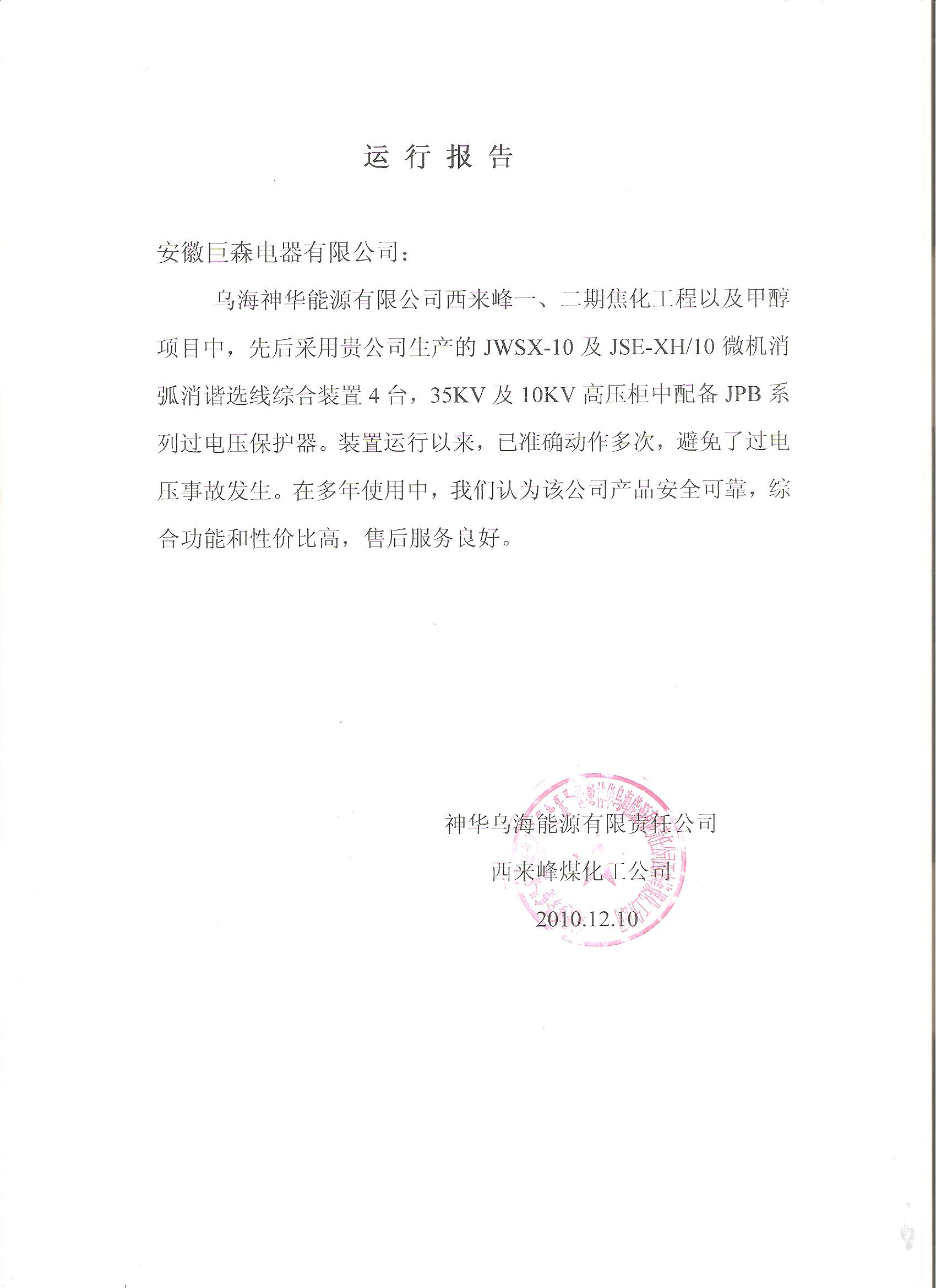 烏海神華能源關于JWSX-10、JSE-XH/10微機消弧消諧選線綜合裝置以及JPB系列過電壓保護器的運行報告