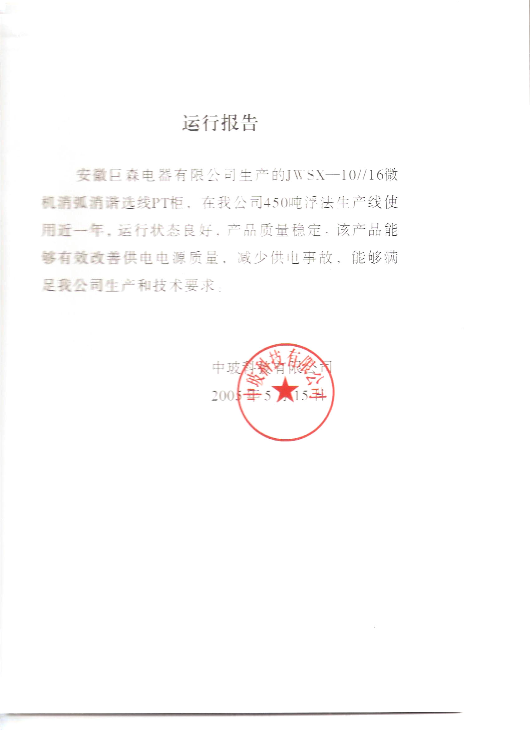中玻科技關于JWSX-10/16微機消弧消諧選線PT柜的運行報告
